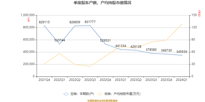 筹码集中度方面,截至2024年一季度末,公司股东总户数为34.59万户,较上年末下降了2.08万户,降幅5.67%;户均持股市值由上年末的89.45万元上升至128万元,增幅为43.1%。
