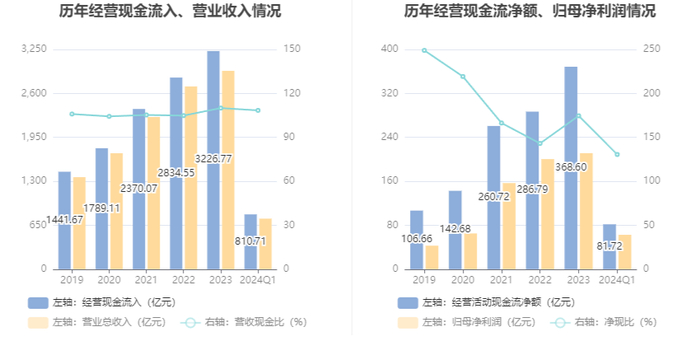 2024年第一季度,公司营业收入现金比为108.42%,净现比为130.53%。