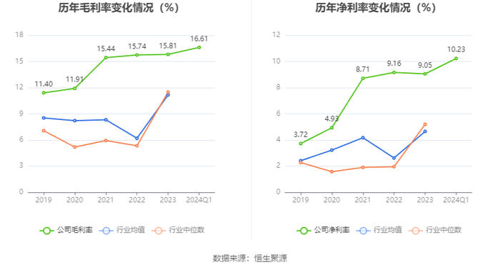 2024年第一季度,公司毛利率为16.61%,同比上升1.08个百分点;净利率为10.23%,较上年同期上升1.05个百分点。