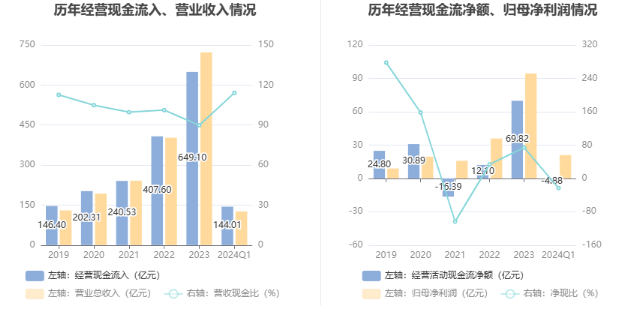 2024年第一季度,公司营业收入现金比为114.17%,净现比为-23.27%。