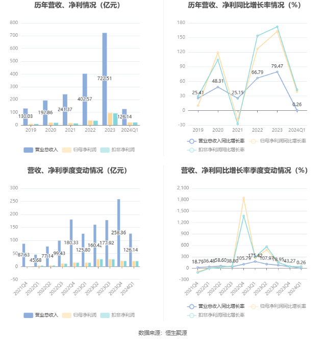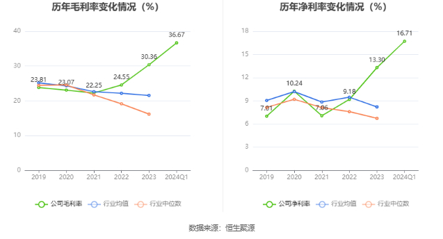 2024年第一季度,公司毛利率为36.67%,同比上升8.67个百分点;净利率为16.71%,较上年同期上升4.55个百分点。