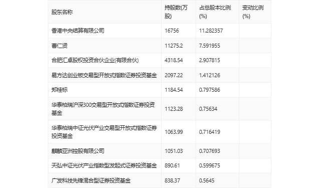 一季报显示,2024年一季度末公司十大流通股东中,新进股东为华泰柏瑞沪深300交易型开放式指数证券投资基金,取代了上年末的广发行业严选三年持有期混合型证券投资基金。在具体持股比例上,易方达创业板交易型开放式指数证券投资基金持股有所上升,香港中央结算有限公司、合肥汇卓股权投资合伙企业(有限合伙)、郑桂标、华泰柏瑞中证光伏产业交易型开放式指数证券投资基金、麒麟亚洲控股有限公司、天弘中证光伏产业指数型发起式证券投资基金、广发科技先锋混合型证券投资基金持股有所下降。