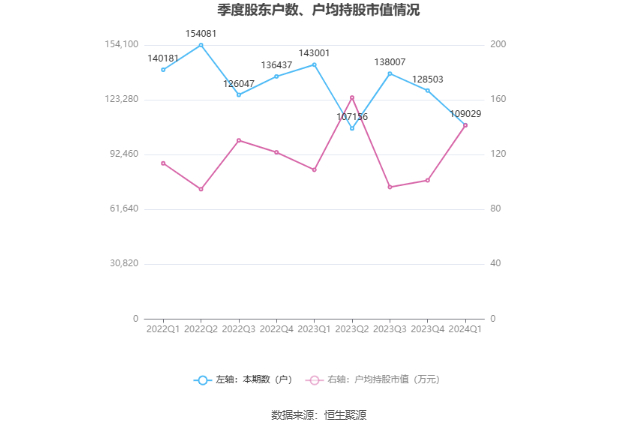 筹码集中度方面,截至2024年一季度末,公司股东总户数为10.9万户,较上年末下降了1.95万户,降幅15.15%;户均持股市值由上年末的101.23万元上升至141.39万元,增幅为39.67%。