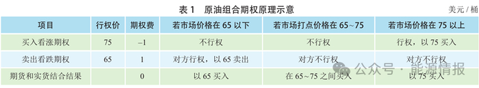 组合或双限期权可以降低甚至抵消权利金,在实际运用中也可以操作,但使用相对更少。由于卖出看跌期权存在一定的敞口风险,因此构建组合期权需要建立在对市场充分地预判和风险足够评估的基础上进行。如,通过2次原油期权操作形成组合期权,买入行权价75美元/桶的看涨期权,卖出行权价65美元/桶的看跌期权,将1美元/桶的权利金相互抵消,同时可实现原油实货价格控制在65~75美元/桶之间(见表1)。