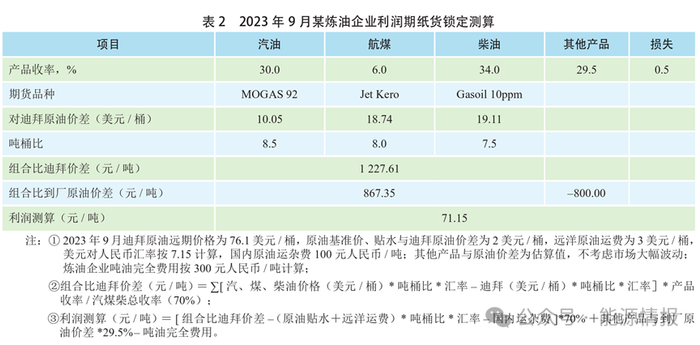 该炼油企业产品为汽油、航煤、柴油、液化气、石油焦、沥青等,相应产品收率见表2,为便于计算和分析,除汽油、航煤、柴油外,其余产品按照其他产品归类。若该炼油企业2023年9月加工量80万吨,为了锁定2023年9月71.15元人民币/吨的远期利润,需锁定成品油期货MOGAS92对迪拜价差24.0万吨,航煤对迪拜价差4.8万吨,柴油对迪拜价差27.2万吨。同时将9月到货的8月计价原油80万吨转计价到9月当月计价,以规避原油计价成本跨月风险。其他产品如有合适的期货合约(如低硫船燃、石油焦、液化气、沥青等),也可以加入炼油利润锁定的期货设计中。在研究选取期纸货产品时,要充分考虑品种的流通性,尽可能选择品种适配性强、流通性好的产品。