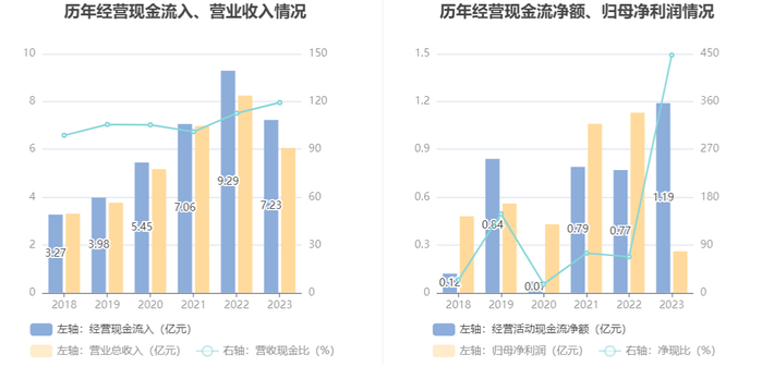 2023年,公司营业收入现金比为119.37%,净现比为447.47%。