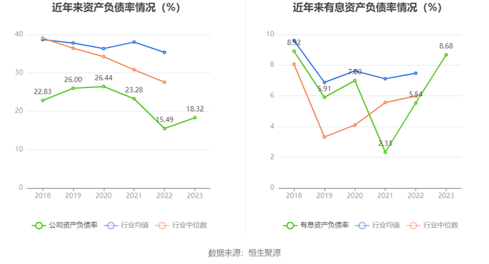 在偿债能力方面,公司2023年年末资产负债率为18.32%,相比上年末上升2.83个百分点;有息资产负债率为8.68%,相比上年末上升3.14个百分点。