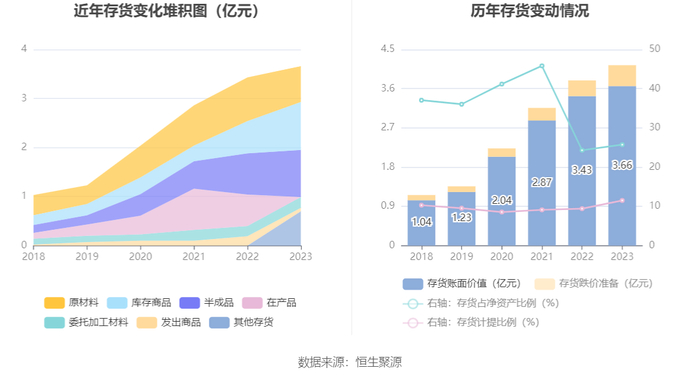 从存货变动来看,截至2023年年末,公司存货账面价值为3.66亿元,占净资产的25.74%,较上年末增加2312.86万元。其中,存货跌价准备为4755.74万元,计提比例为11.5%。