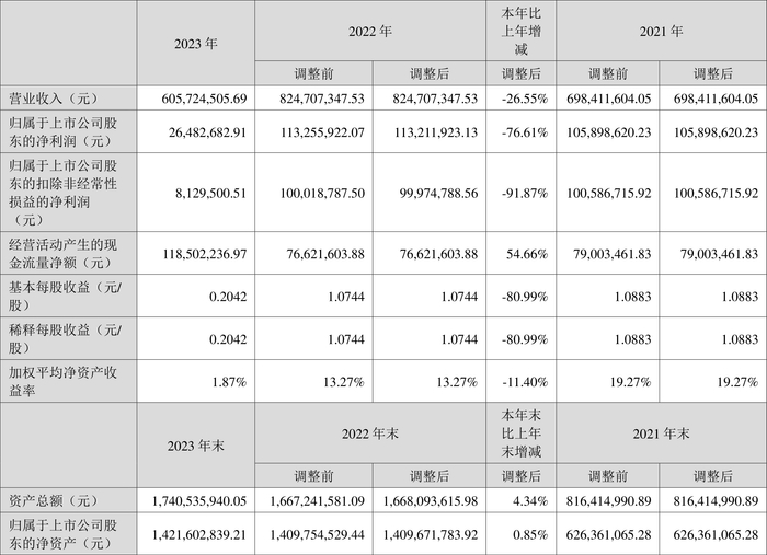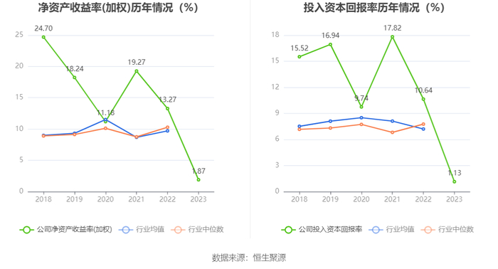 数据显示,2023年公司加权平均净资产收益率为1.87%,较上年同期下降11.40个百分点;公司2023年投入资本回报率为1.13%,较上年同期下降9.51个百分点。