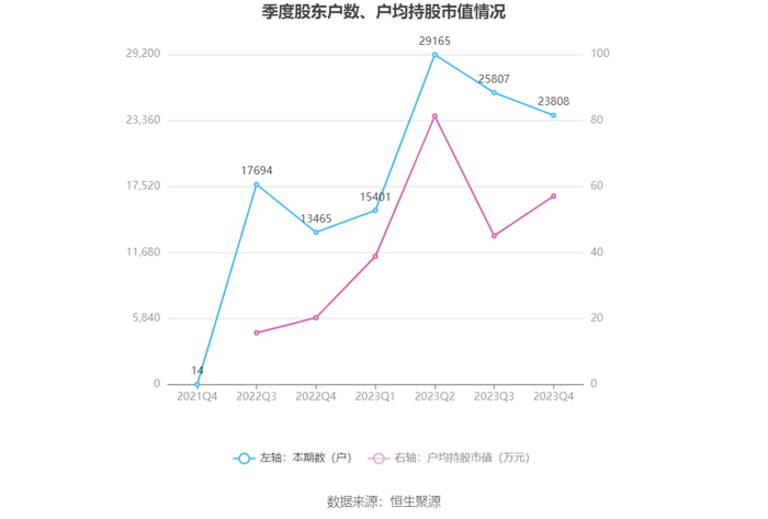 筹码集中度方面,截至2023年年末,公司股东总户数为2.38万户,较三季度末下降了1999户,降幅7.75%;户均持股市值由三季度末的45.06万元上升至57.08万元,增幅为26.68%。