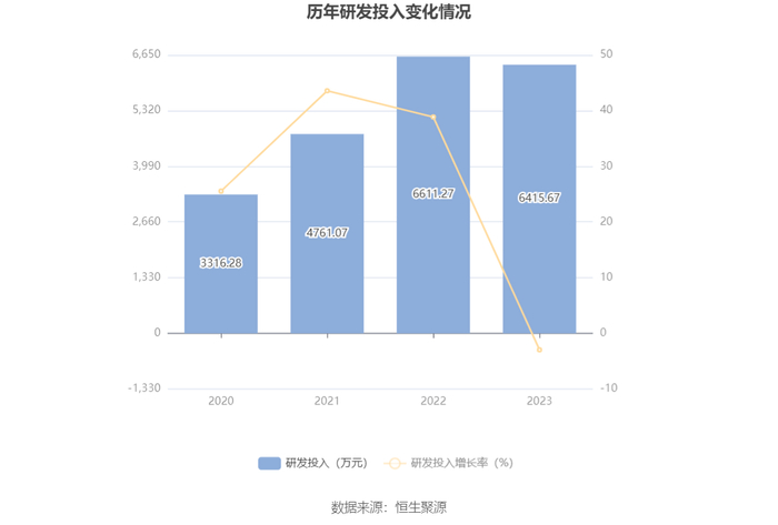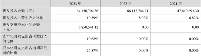 2023年全年,公司研发投入金额为6415.67万元,同比下降2.96%;研发投入占营业收入比例为10.59%,相比上年同期上升2.57个百分点。此外,公司全年研发投入资本化率为10.68%。