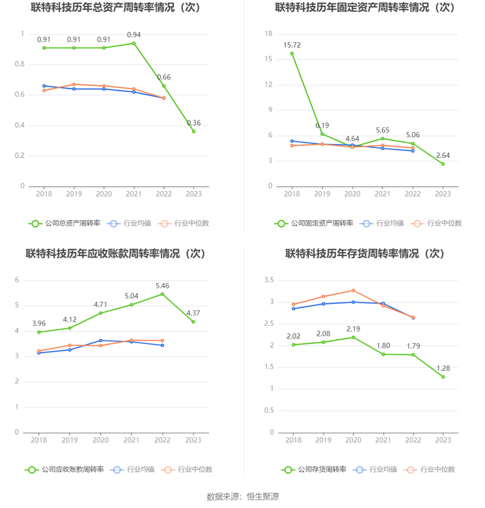 营运能力方面,2023年,公司公司总资产周转率为0.36次,上年同期为0.66次(2022年行业平均值为0.58次,公司位居同行业13/36);固定资产周转率为2.64次,上年同期为5.06次(2022年行业平均值为4.19次,公司位居同行业17/36);公司应收账款周转率、存货周转率分别为4.37次、1.28次。