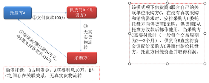 从上述特征的分析可以看出,“以贸易业务为名对外提供或出借资金”为表现形式的违规托盘贸易通常是托盘方(出资方)为了实现其对外提供或出借资金的目的,而开展的没有商业实质的垫资贸易业务,为实际资金需求方以垫资贸易方式提供融资。
