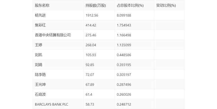 一季报显示,2024年一季度末公司十大流通股东中,新进股东为王婷、刘凯、刘娟、陆李艳、王光坤、石庭波、BARCLAYS BANK PLC,取代了上年末的高盛公司有限责任公司、UBS AG、太平行业优选股票型证券投资基金、元涞泰涞1号私募证券投资基金、刘宏彦、王忠友、信弘泰和2号私募证券投资基金。在具体持股比例上,杨先进、香港中央结算有限公司持股有所上升,焦彩红持股有所下降。