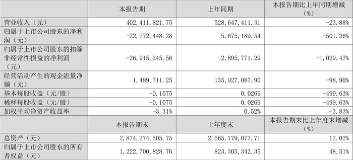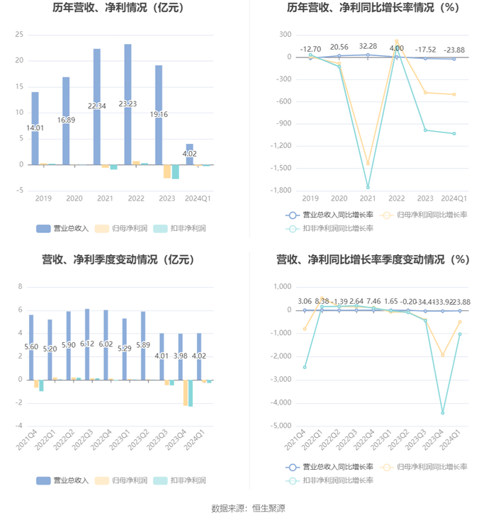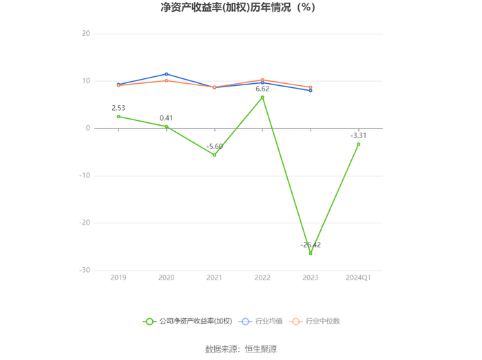 数据显示,2024年第一季度公司加权平均净资产收益率为-3.31%,较上年同期下降3.83个百分点;公司2024年第一季度投入资本回报率为-1.00%,较上年同期下降1.97个百分点。
