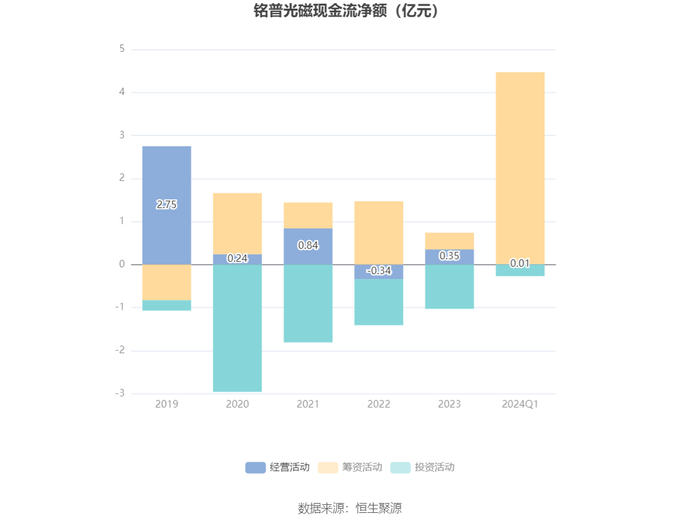 2024年第一季度,公司经营活动现金流净额为148.97万元,同比下降98.90%,主要系销售商品、提供劳务收到的现金减少所致;筹资活动现金流净额4.46亿元,同比增加5.80亿元,主要系吸收投资收到的现金增加所致;投资活动现金流净额-2735.38万元,上年同期为-2354.53万元。