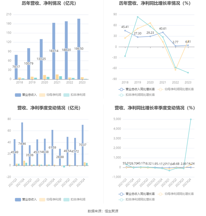 中证智能财讯 科大讯飞(002230)4月23日披露2023年年报。2023年,公司实现营业总收入196.50亿元,同比增长4.41%;归母净利润6.57亿元,同比增长17.12%;扣非净利润1.18亿元,同比下降71.74%;经营活动产生的现金流量净额为3.50亿元,同比下降44.55%;报告期内,科大讯飞基本每股收益为0.28元,加权平均净资产收益率为3.94%。公司2023年年度利润分配预案为:拟向全体股东每10股派1元(含税)。