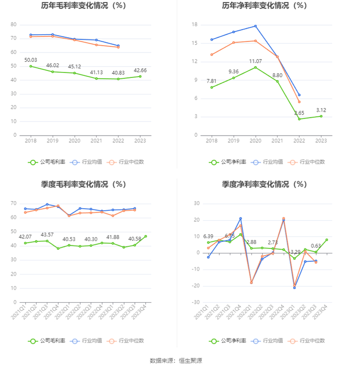 2023年,公司毛利率为42.66%,同比上升1.83个百分点;净利率为3.12%,较上年同期上升0.47个百分点。从单季度指标来看,2023年第四季度公司毛利率为46.90%,同比上升4.75个百分点,环比上升6.32个百分点;净利率为8.07%,较上年同期上升5.97个百分点,较上一季度上升7.44个百分点。