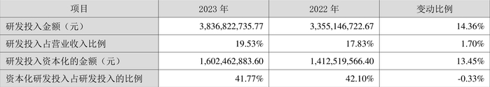 2023年全年,公司研发投入金额为38.37亿元,同比增长14.36%;研发投入占营业收入比例为19.53%,相比上年同期上升1.70个百分点。此外,公司全年研发投入资本化率为41.77%。