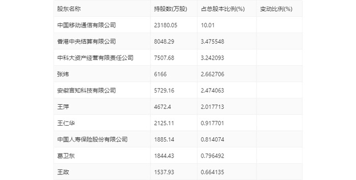年报显示,2023年年末公司十大流通股东中,持股最多的为中国移动通信有限公司,占比10.01%。十大流通股东名单相比2023年三季报维持不变。在具体持股比例上,张炜、中国人寿保险股份有限公司持股有所上升,中国移动通信有限公司、香港中央结算有限公司、中科大资产经营有限责任公司、安徽言知科技有限公司、王萍、王仁华、葛卫东、王政持股有所下降。