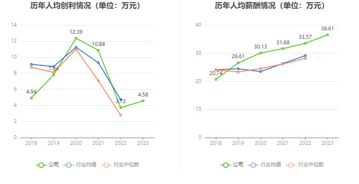 截至2023年末,公司员工总数为14356人,人均创收136.88万元,人均创利4.58万元,人均薪酬36.61万元,较上年同期分别增长9.43%、22.75%、9.06%。