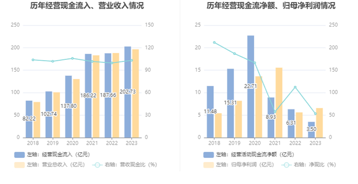 2023年,公司经营活动现金流净额为3.50亿元,同比下降44.55%;筹资活动现金流净额28.30亿元,同比增加31.48亿元;投资活动现金流净额-39.79亿元,上年同期为-17.04亿元。