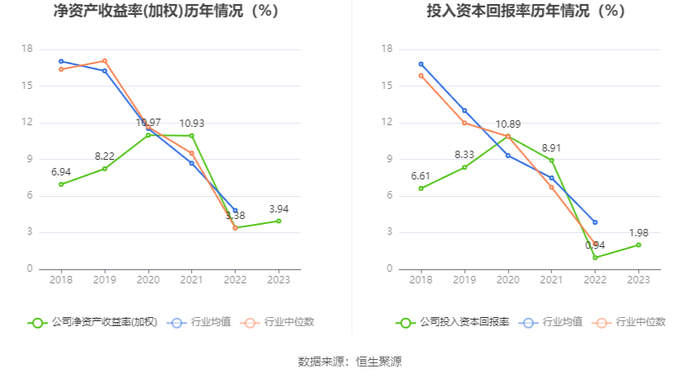 数据显示,2023年公司加权平均净资产收益率为3.94%,较上年同期增长0.56个百分点;公司2023年投入资本回报率为1.98%,较上年同期增长1.04个百分点。