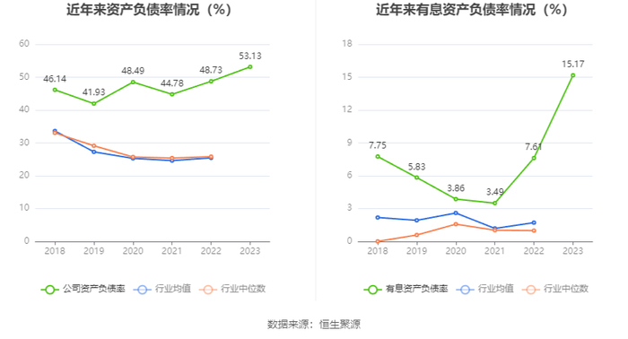 在偿债能力方面,公司2023年年末资产负债率为53.13%,相比上年末上升4.40个百分点;有息资产负债率为15.17%,相比上年末上升7.56个百分点。