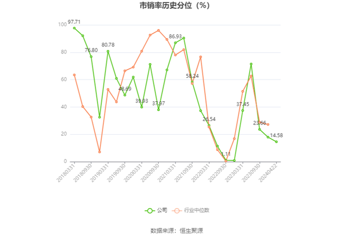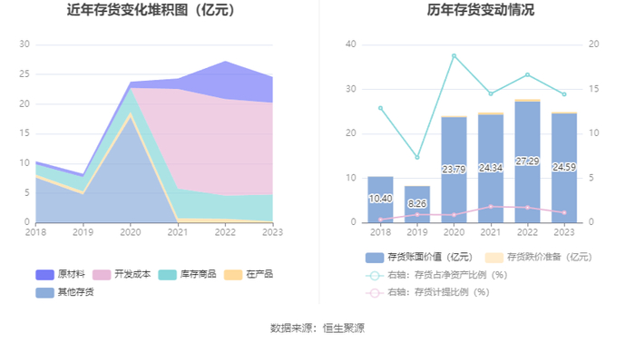 从存货变动来看,截至2023年年末,公司存货账面价值为24.59亿元,占净资产的14.44%,较上年末减少2.7亿元。其中,存货跌价准备为2871.44万元,计提比例为1.15%。