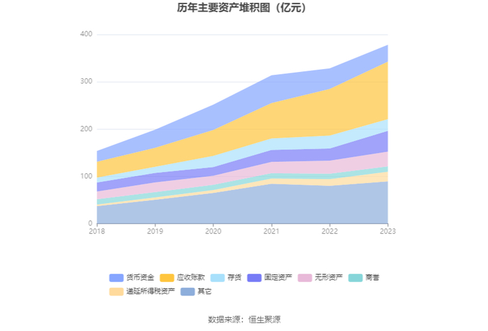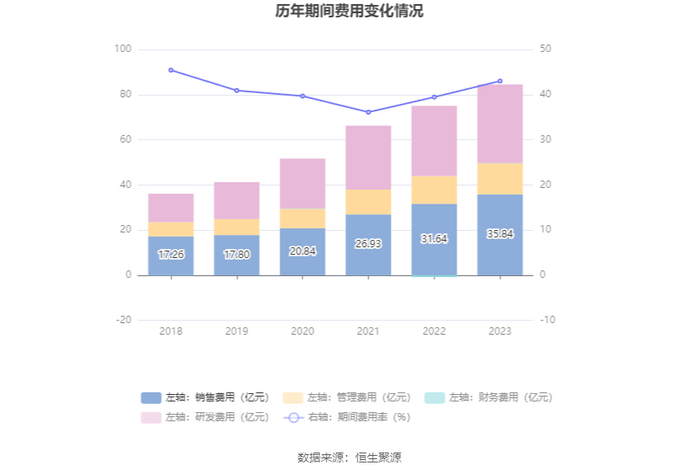 2023年,公司期间费用为84.51亿元,较上年同期增加10.27亿元;期间费用率为43.01%,较上年同期上升3.56个百分点。其中,销售费用同比增长13.26%,管理费用同比增长11.7%,研发费用同比增长11.89%,财务费用由去年同期的-7855.10万元变为1535.07万元。