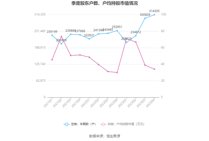 筹码集中度方面,截至2023年年末,公司股东总户数为31.43万户,较三季度末增长了1.35万户,增幅4.48%;户均持股市值由三季度末的39.00万元下降至34.17万元,降幅为12.38%。