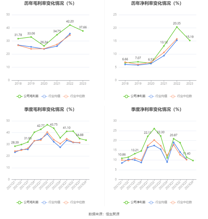 2023年,公司毛利率为37.66%,同比下降4.54个百分点;净利率为15.19%,较上年同期下降5.16个百分点。从单季度指标来看,2023年第四季度公司毛利率为33.58%,同比下降1.96个百分点,环比下降1.30个百分点;净利率为9.70%,较上年同期下降1.35个百分点,较上一季度下降1.70个百分点。