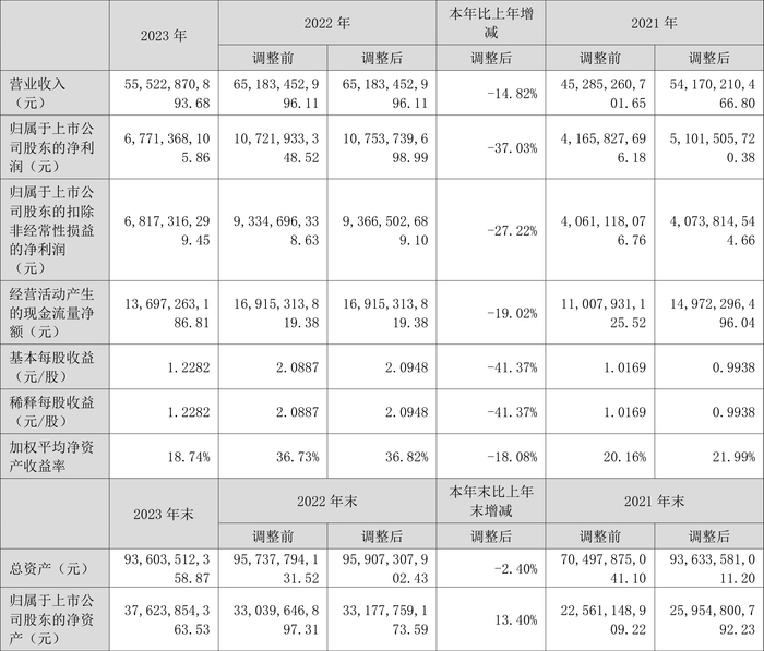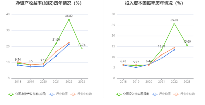 数据显示,2023年公司加权平均净资产收益率为18.74%,较上年同期下降18.08个百分点;公司2023年投入资本回报率为15.60%,较上年同期下降10.16个百分点。