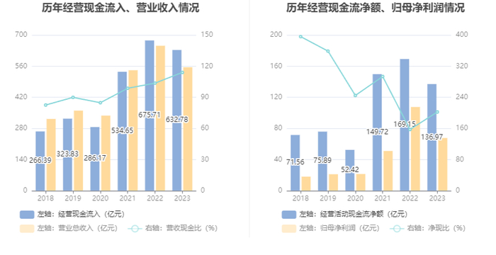 2023年,公司经营活动现金流净额为136.97亿元,同比下降19.02%;筹资活动现金流净额-84.05亿元,同比增加5.81亿元;投资活动现金流净额-24.65亿元,上年同期为-17.65亿元。