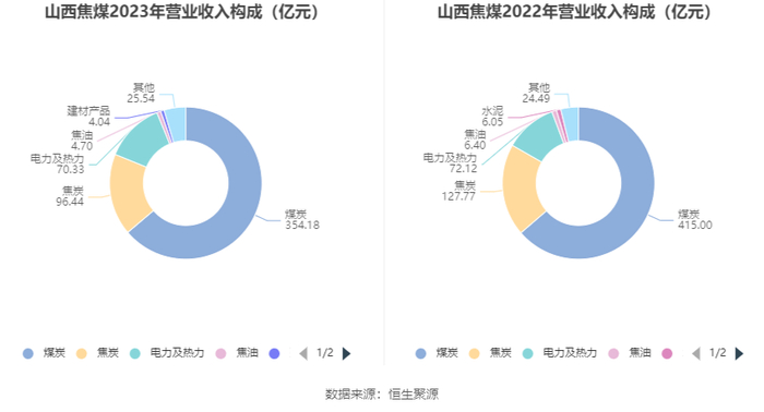 分产品来看,2023年公司主营业务中,煤炭收入354.18亿元,同比下降14.65%,占营业收入的63.79%;焦炭收入96.44亿元,同比下降24.52%,占营业收入的17.37%;电力及热力收入70.33亿元,同比下降2.49%,占营业收入的12.67%。