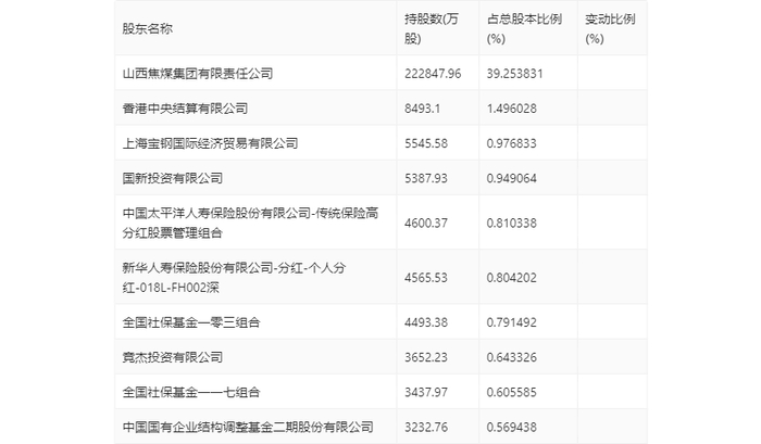 年报显示,2023年年末公司十大流通股东中,新进股东为上海宝钢国际经济贸易有限公司、国新投资有限公司、新华人寿保险股份有限公司-分红-个人分红-018L-FH002深、竞杰投资有限公司、中国国有企业结构调整基金二期股份有限公司,取代了三季度末的全国社保基金一零一组合、景顺长城能源基建混合型证券投资基金、太原市杰森实业有限公司、上海同能投资控股有限公司、太平洋资管-农业银行-卓越财富股息价值股票型产品。在具体持股比例上,中国太平洋人寿保险股份有限公司-传统保险高分红股票管理组合、全国社保基金一零三组合、全国社保基金一一七组合持股有所上升,香港中央结算有限公司持股有所下降。