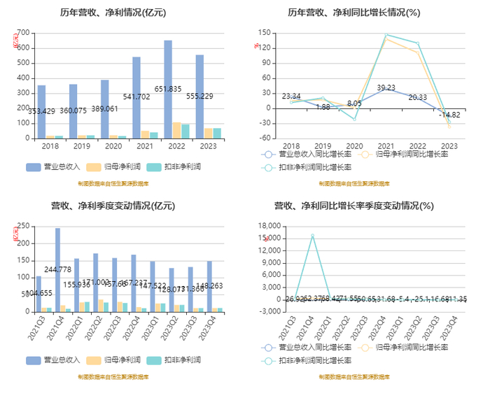 中证智能财讯 山西焦煤(000983)4月23日披露2023年年报。2023年,公司实现营业总收入555.23亿元,同比下降14.82%;归母净利润67.71亿元,同比下降37.03%;扣非净利润68.17亿元,同比下降27.22%;经营活动产生的现金流量净额为136.97亿元,同比下降19.02%;报告期内,山西焦煤基本每股收益为1.2282元,加权平均净资产收益率为18.74%。公司2023年年度利润分配预案为:拟向全体股东每10股派8元(含税)。
