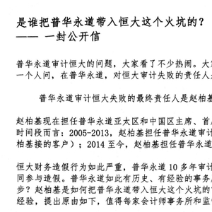 4月13日起,一封标题为《是谁把普华永道带入恒大这个火坑?》的公开信,在互联网流传,将恒大审计失职一事指向普华永道亚太及其中国主席赵柏基。