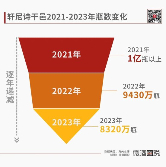 不止保乐力加,其他洋酒巨头也出现了“强预期”的业绩下跌。2023年第四季度,人头马君度的销量下降23.5%,主要品类在中国市场的销售额出现了非常强的双位数下滑;2023年全年,LVMH的干邑&烈酒部门营收31.41亿欧元(约合人民币244.06亿元),同比有机下滑10%。以轩尼诗为代表的干邑,共售出8320万瓶,同比下降11.77%,而该数据2021年还维持在1亿瓶以上。