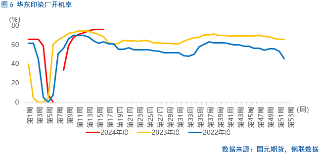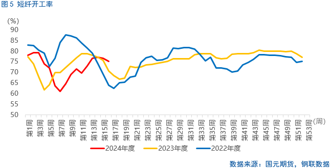 非铝需求变动小幅下降。聚酯纤维短纤开工率居于近三年同期高位,但出现季节性回落。截至4月19日,聚酯纤维短纤周度开工率为75.14%,环比下滑了1.46个百分点;华东印染厂开工维持在76.19%,表现强于近三年同期。