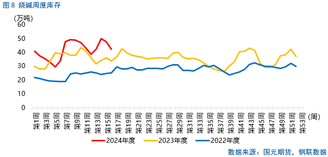 因此从库存上看,截至4月19日,全国20万吨及以上液碱样本企业厂库库存42.45万吨(湿吨),环比下滑11.32%,其中华北区域库容比24.43%,环比下滑3.06个百分点。
