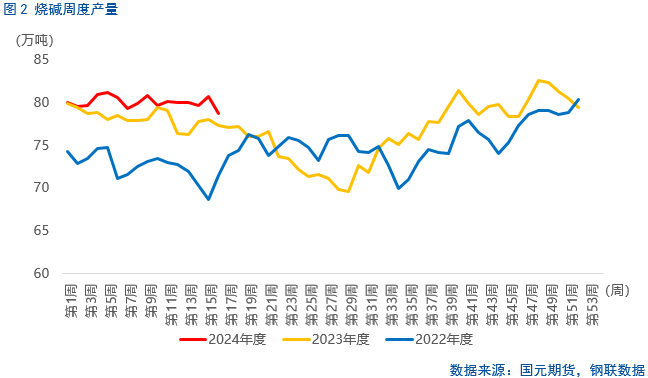 此外,烧碱的主要副产品为液氯,液碱及液氯生产比例约为1:0.886,因此氯碱一体化企业通常会参考综合利润调节其生产行为。上周主产地山东氯碱企业毛利下滑,对装置开工难有支撑。截至4月18日,山东氯碱企业周平均毛利在476元/吨,较前一周减少155元/吨,环比下降25%,主要是液氯价格下滑所致。截至4月19日,山东液氯主流价格从4月10日的650元/吨下滑350元/吨至300元/吨;而山东32%液碱市场价上涨20元/吨至760元/吨。