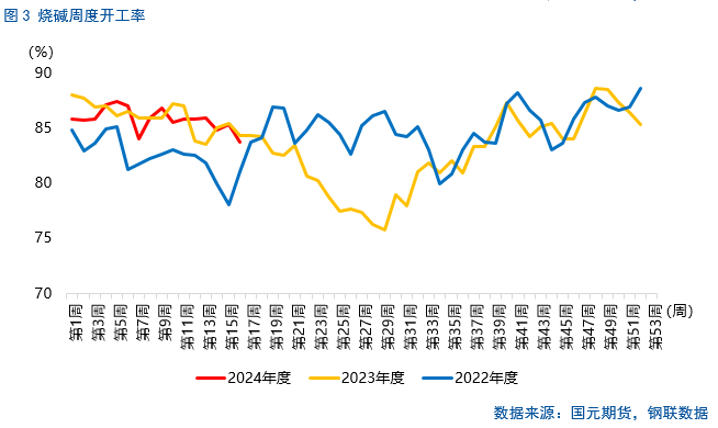 烧碱的主要下游氧化铝近期行情偏强,随着供应端内矿小规模恢复,需求端有所增量,库存持续下滑,叠加利润修复的影响,氧化铝企业开工仍有上升预期,对烧碱行情有所支撑。据SMM数据,截至上周四,全国氧化铝周度开工率环比上涨0.02个百分点至81.94%,开工情况整体较为稳定,当前行业利润偏高,市场情绪好转。截至4月18日,上周山东地区氧化铝周度开工维持93.27%,河南地区氧化铝周度开工维持在66.41%,贵州地区氧化铝周度开工维持在79.48%;冶金级氧化铝行业利润环比修复1.7%至496.9元/吨,国内氧化铝库存环比下滑1.2万吨至439.7万吨。