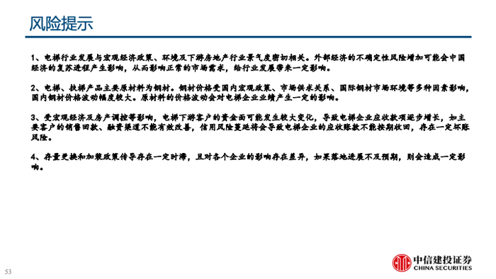 4、存量更换和加装政策传导存在一定时滞,且对各个企业的影响存在差异,如果落地进展不及预期,则会造成一定影响。
