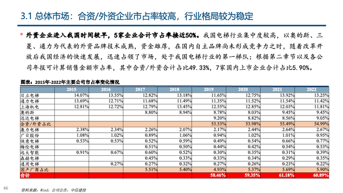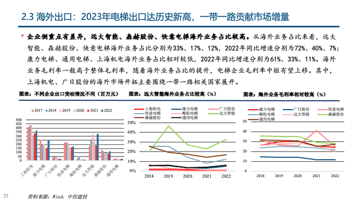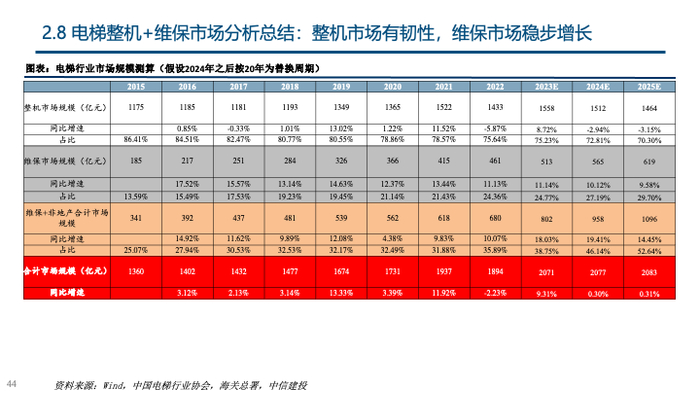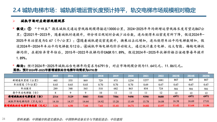 政策激发更新与加装两大存量市场需求,非新建地产需求支撑行业稳步增长。①存量更新需求:我国存量电梯逐步进入替换周期,此前政策支持力度不明显的情况下,电梯更换周期被普遍拉长,而目前在政策引导下,预计更换周期有望缩短,假设运行15年以上的电梯将在第16-20年逐步完成替换,预计2024年对应存量替换量为17.37万台,同比增长322.52%,存量替换市场规模为209.00亿元,同比增长314.07%,2023年-2030年存量替换量CAGR达44.37%;②加装市场:2023年加装市场迎来重大政策变化,《中华人民共和国无障碍环境建设法》标志着支持电梯加装正式入法,此前加装痛点有望疏通,超过250万台潜在加装市场空间将实现快速放量,乐观假设下,平均每年将提供25万台市场增量,相当于2022年产量的23%,预计2024年加装量10万台;③出口市场:2023年我国电梯出口量9.78万台,预计占2023年整体产量比例为12%,一带一路市场发力明显,预计2024年出口量10.76万台,同比增长10%。④轨交市场:轨道交通电扶梯市场相对稳定,预计2023年-2025年城轨站台电梯年均需求为6971台,约相当于2023年产量的0.73%;⑤新建地产需求:2023年竣工面积同比增速达17%,根据目前新开工数据,预计2024、2025年竣工面积均下降10%,考虑电梯配置密度提升,预计新建地产对应电梯销量均下降10%至93、84万台。综合①—⑤,预计2024-2025年电梯整机市场销量分别为132.77、132.86万台,同比分别增长8.13%、0.07%;电梯整机市场规模分别为1659、1629亿元,同比增长6.49%、-1.79%。⑥维保服务市场:根据2022年保有量与2023年新梯市场数据,预计2023年电梯保有量为1057万台,市场空间513亿,占2023年市场空间的25%;维保服务业务在高保有量下支撑下规模稳步增长,测算可得2023年-2025年市场空间CAGR为10.73%。综合①-⑥,预计2024-2025年电梯行业总市场规模分别为2228、2258亿元,同比分别增长7.60%、1.34%。