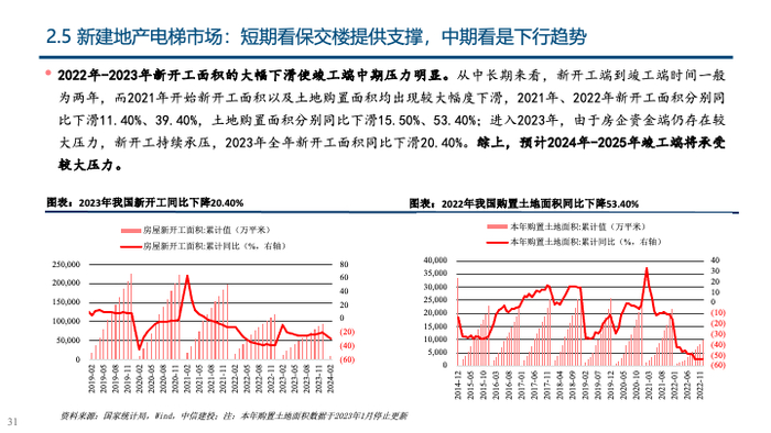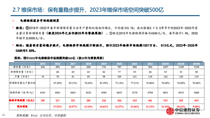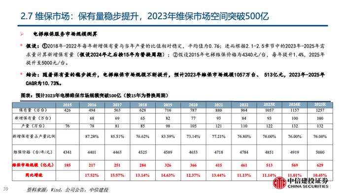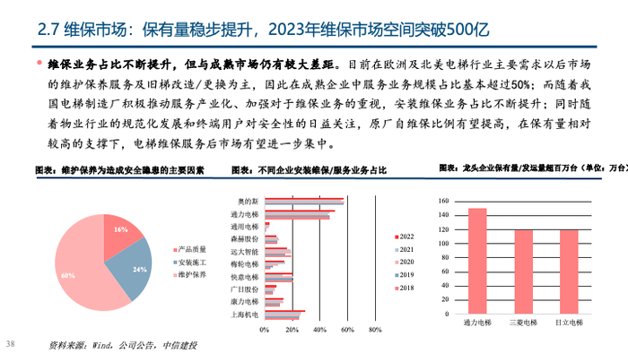 2023年至今,电梯存量市场不断有众多利好政策出台,以《推进建筑和市政基础设施设备更新工作实施方案》、 《中华人民共和国无障碍环境建设法》为代表的重大政策及法案的推出有望激活更新与加装两大存量市场需求。同时,维保市场体量巨大,服务后市场逐步成为电梯公司战略核心业务,在原厂维保的推动下,维保业务有较大空间;综上,在存量市场的需求激活下,有望对冲地产竣工端下行带来的减量,且电梯企业在业务结构调整下,估值中枢有望上移。