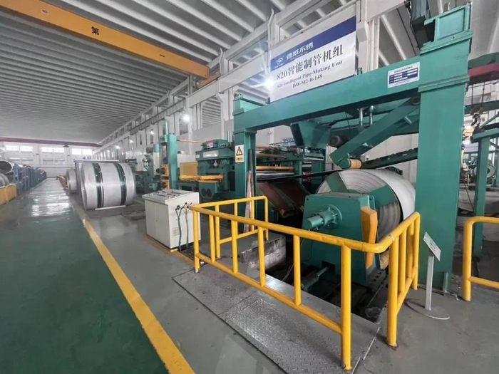 走进德威不锈钢820智能制管机组车间内,生产线机器轰鸣,焊花璀璨,全自动化的生产线正高速运转,一派繁忙景象。