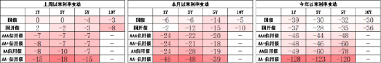 同业存单方面,上周发行利率大体下行,其中发行规模最多的1Y股份银行下行6BP,为2.08%,1Y国有银行下行7BP,为2.06%。