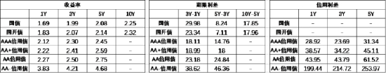 期限利差方面,上周利差大体收窄,30年国债利率降至2.44,低于MLF利率的2.5,收益率曲线仍然极为平坦。