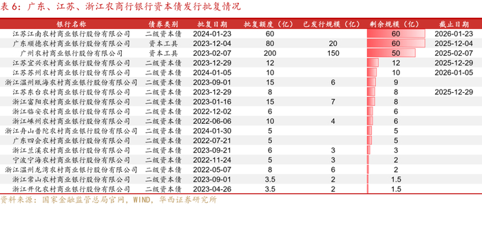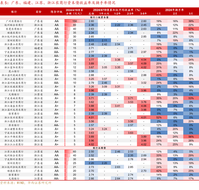 另外,也可关注发达地区农商行一级市场新发债。根据国家金融监管总局披露的银行资本工具发行批复文件,截至2024年4月21日,已批复未发行的银行资本债约1.1万亿元,其中农商行有389.6亿元。其中,广东、江苏和浙江已批复未发行的农商行资本债共249亿元,江南农商行、顺德农商行和广州农商行剩余额度较大,均在50亿元及以上。